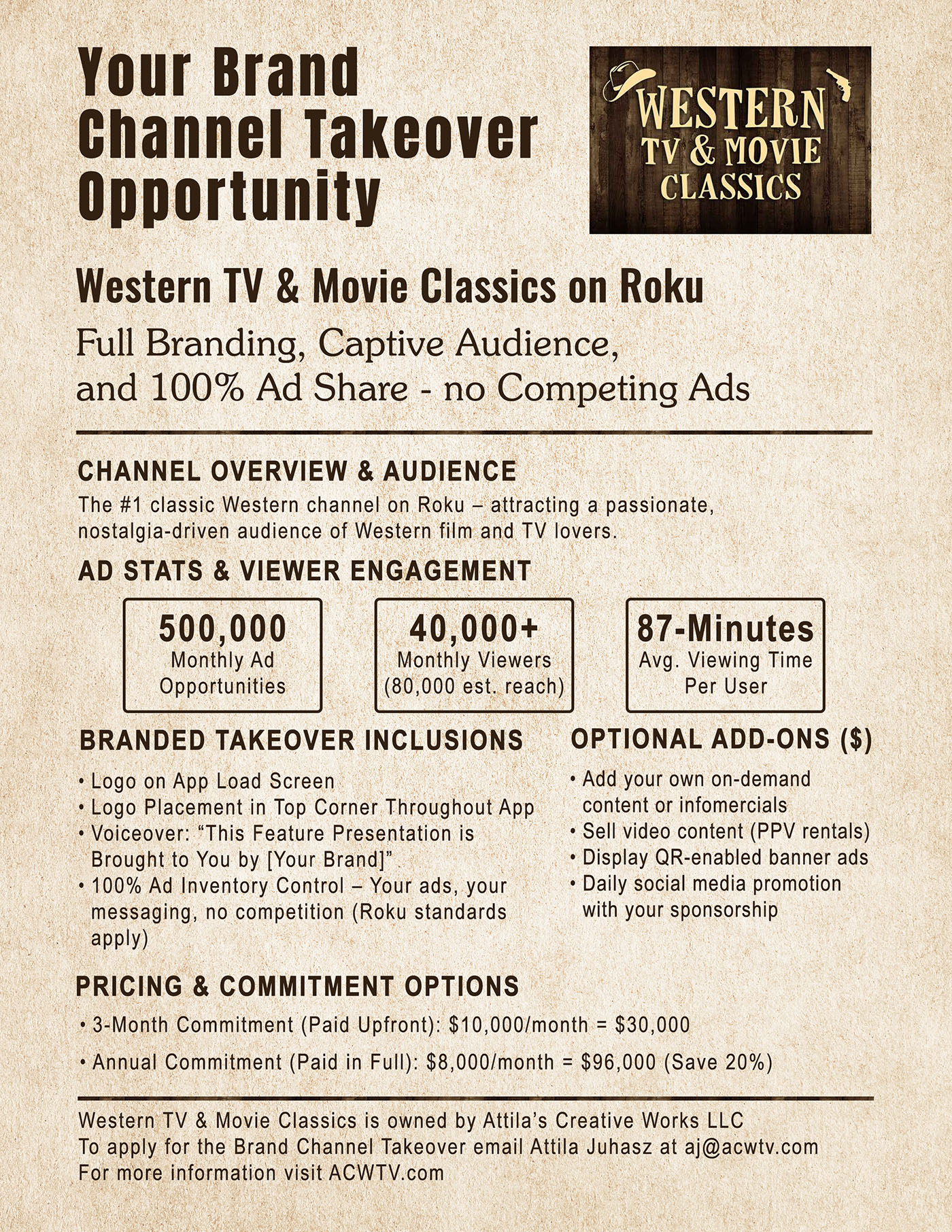 You get a turnkey branded channel experience that positions your brand as the hero of the West—complete with voiceover intros, immersive ad placement, and full visual branding across the Roku experience.